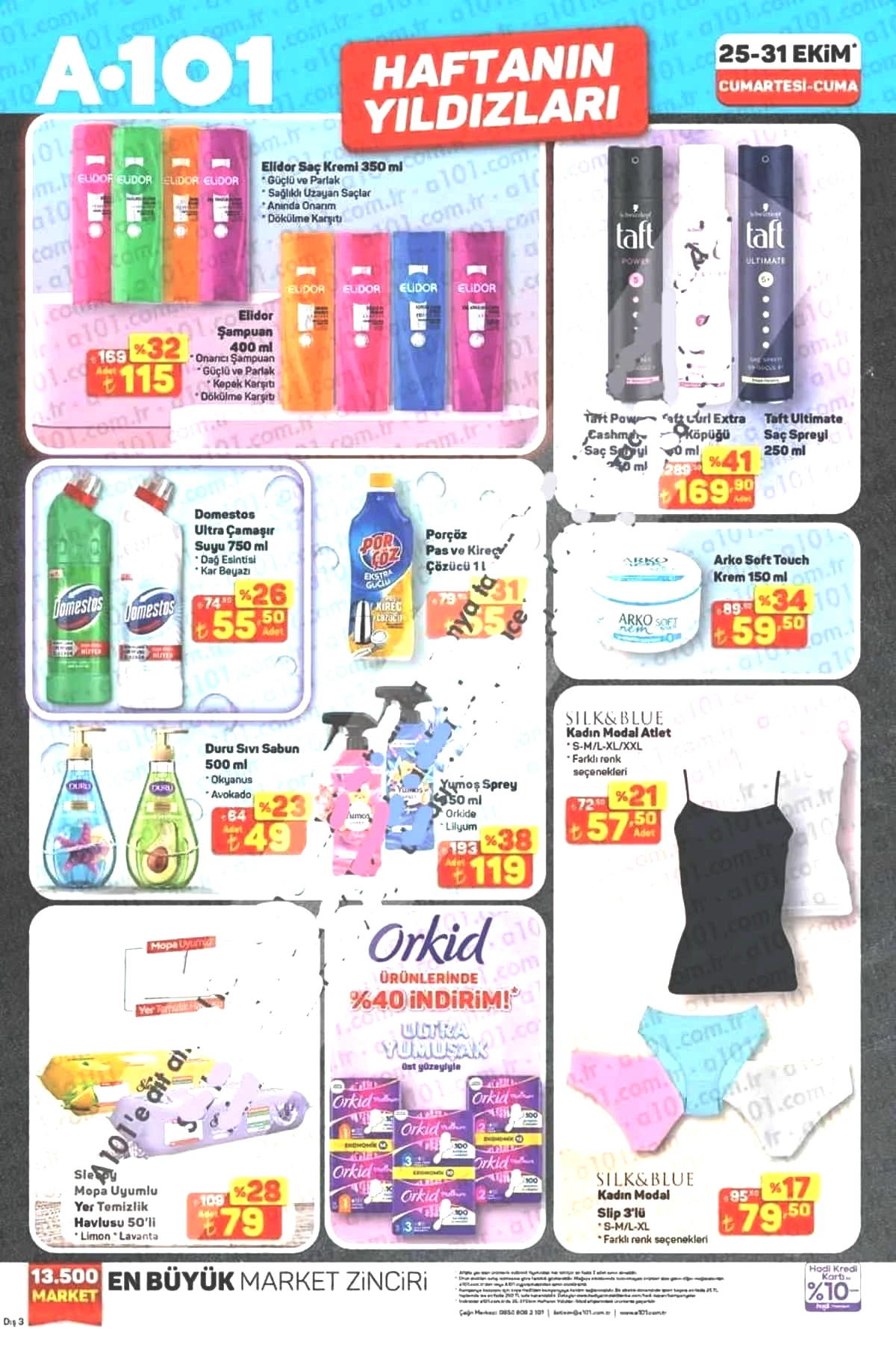 A101, 25 Ekim - 31 Ekim tarihleri arasında geçerli olan “Haftanın Yıldızları” kampanyasında kişisel bakım ve temizlik ürünlerini cazip fiyatlarla sunuyor.